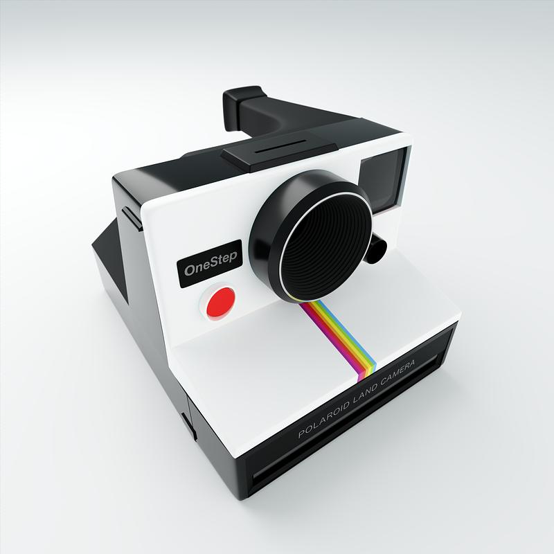 Vintage instant camera, evenly lit computer generated image on a fresh yellow studio background. CGI/3D model based on the popular instant camera first introduced in 1977.