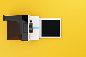 Vintage instant camera, evenly lit computer generated image on a fresh yellow studio background. CGI/3D model based on the popular instant camera first introduced in 1977.